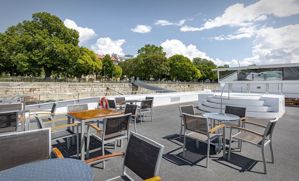 • Открытая Кухня для Барбекю: Наслаждайтесь свежеприготовленными деликатесами прямо под открытым небом на солнечной палубе, где потрясающие пейзажи Дуная служат идеальным фоном для вашего обеда.