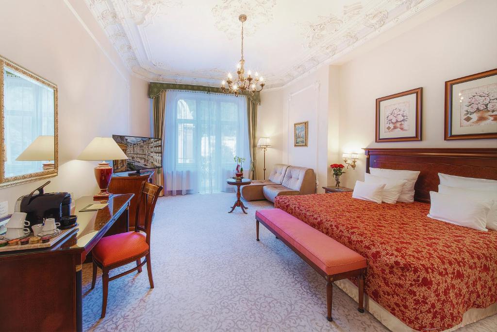 Главное преимущество находящихся в историческом здании номеров – высокие потолки с лепниной, ванны и биде в ванной и отдельный от ванной туалет. Эти номера возникли в результате общей реконструкции исторической части при строгом контроле управления охраны памятников истории и культуры. Все 60 номеров расположены на 2 – 5 этаже. Single Princess — площадь 22 m2. Кровать 160 x 200 см, ванная комната с душем туалет и биде, вид на внутренний парк. Double Excellent — площадь 32 m2. Здесь лепные укращения, ванная комната с ванной и отдельный от ванной туалет и биде. Вид на курортную зону. Double Supreme — площадь 38 m2. Здесь лепные укращения, ванная комната с ванной и отдельный от ванной туалет и биде. Вид на курортную зону или на внутренний парк. Suite Junior — площадь 46 m2. Здесь лепные укращения, ванная комната с ванной и отдельный от ванной туалет и биде. Вид на курортную зону. Suite Carlsbad — площадь 64 m2, гостиная, спальня и ванная. Suite Splendid — двухкомнатные апартаменты площадью 64 м2, большая ванная комната с ванной и душевой Suite Wellness — двухкомнатные апартаменты, ванная комната с джакузи и собственная сауна, душевая, отдельный туалет с биде и отдельный туалет для гостей.Общая площадь 94 m2. Suite Exclusive — площадью 115 м2, с видом на курортную зону Карловых Вар, состоят из гостиной и спальни с двуспальной кроватью. Есть возможность поставить дополнительную кровать для третьего гостя. Апартаменты расположены на 5 этаже в исторической части отеля. Suite Moser Crystal — площадь 165 m2, телевизор в ванной комнате, джакузи и собственная сауна, комната для горничной или личного телохранителя с одной кроватью и собственной ванной комнатой с душем и туалетом. TWIN кровати только в номерах Superior (New House), Junior Suite (Old House) Connect номера: Superior+Comfort Plus (New House), Junior Suite+Supreme (Old House), Carlsbad Suite+Excellent (Old House).