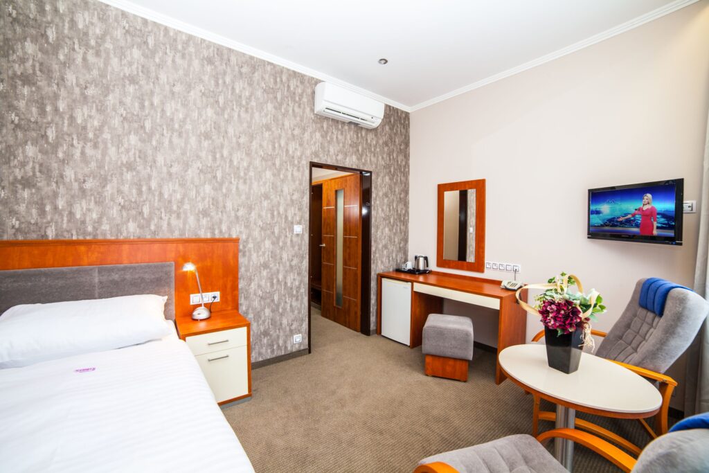 18 одноместных номеров, 52 двухместных номера, 6 люксов. В номерах есть кондиционер, Wi-Fi, ЖК-телевизор/спутниковое телевидение, телефон, холодильник, электрический чайник, ванная комната (ванна или душ), фен. В люксах имеется небольшая мини-кухня, сейф. Ресепшн Kriváň.