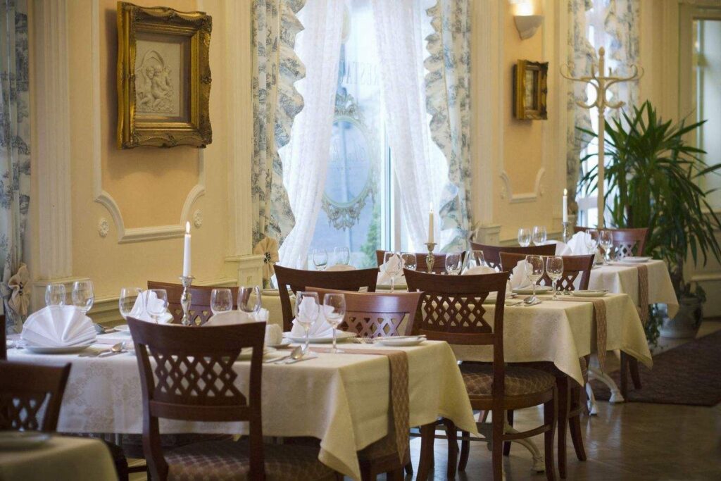 Санаторий располагает двумя ресторанами. Ресторан Grand Restaurant расположен на двух этажах и имеет два зала. У ресторана U Křížovníků отдельный вход в здание отеля, он работает как самостоятельный классический ресторан с большим ассортиментом изысканных блюд. Интерьер ресторана сочетает комфорт и стиль средневековой корчмы Тевтонского ордена. Меню предлагает широкий выбор традиционных блюд чешской кухни, разливное пиво, хорошие вина и многое другое.